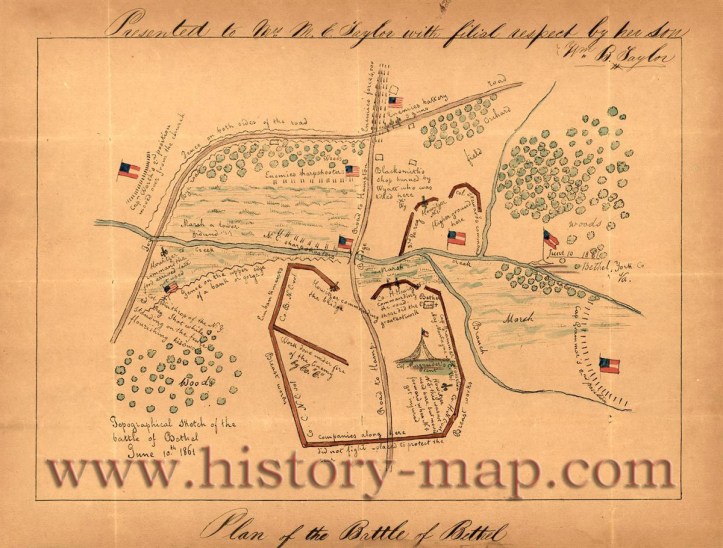 22. december 201723. december 2017Henry Høgh Map Battle of Big Bethel Created in 1861. Shows troop positions and little illustrations of flags