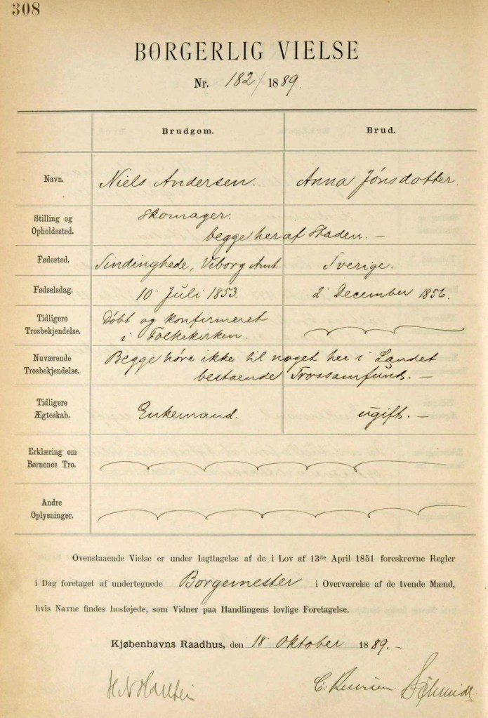 Niels og Anna Borgerlige-vielsesproto-Civil-Marriages