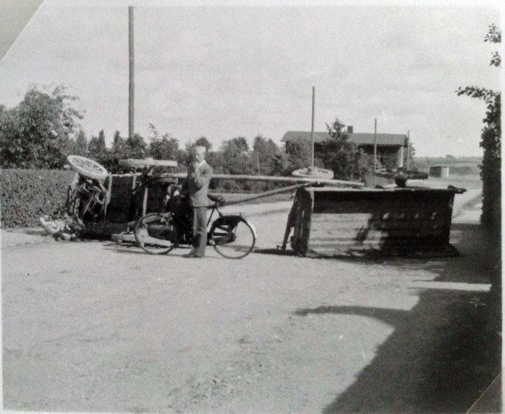 En beskeden/symbolsk vejspærring på en af indfaldsvejene til Holbæk. – Emry med gæssene, hvor våbnene blev gravet ned.