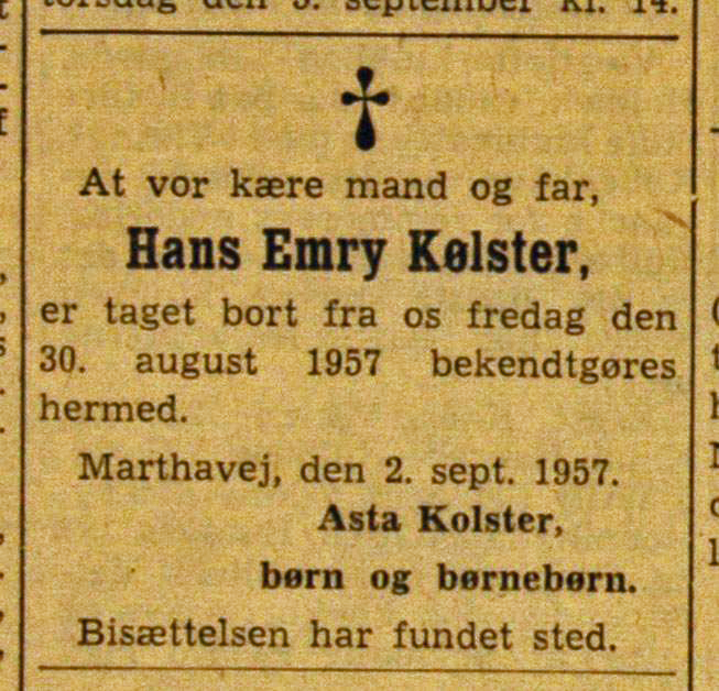 English summary: In the previous section in the series about the house at Marthavej, family events in the Kølster family were presented from 1930 – 1940 (see link here). In this section, the story continues until 1958, when Emry Kølster died, the house was sold, and Asta moved to Oldmarken in Bagsværd, Copenhagen. Sources for this are Maria’s  Grandfather Emry’s Memoirs.